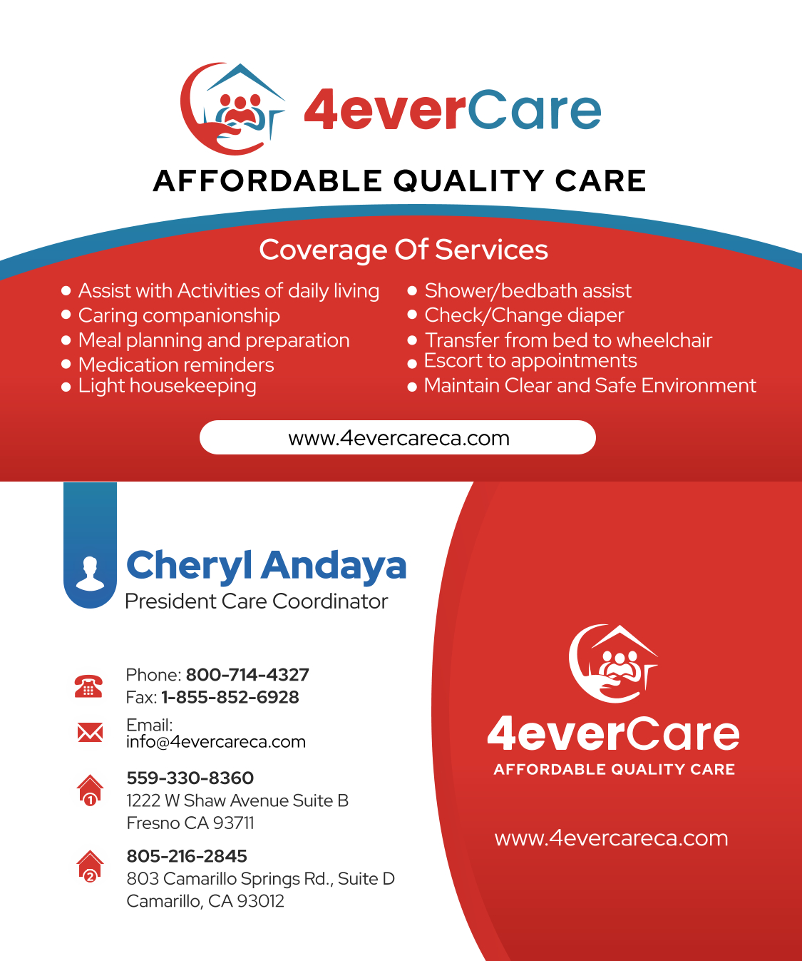 As a county government employee with a department that serves the County of Ventura, your agency models the same vision in striving for quality service to our citizens. I highly recommend 4EverCare Services to any family in needed of quality care for a love one.